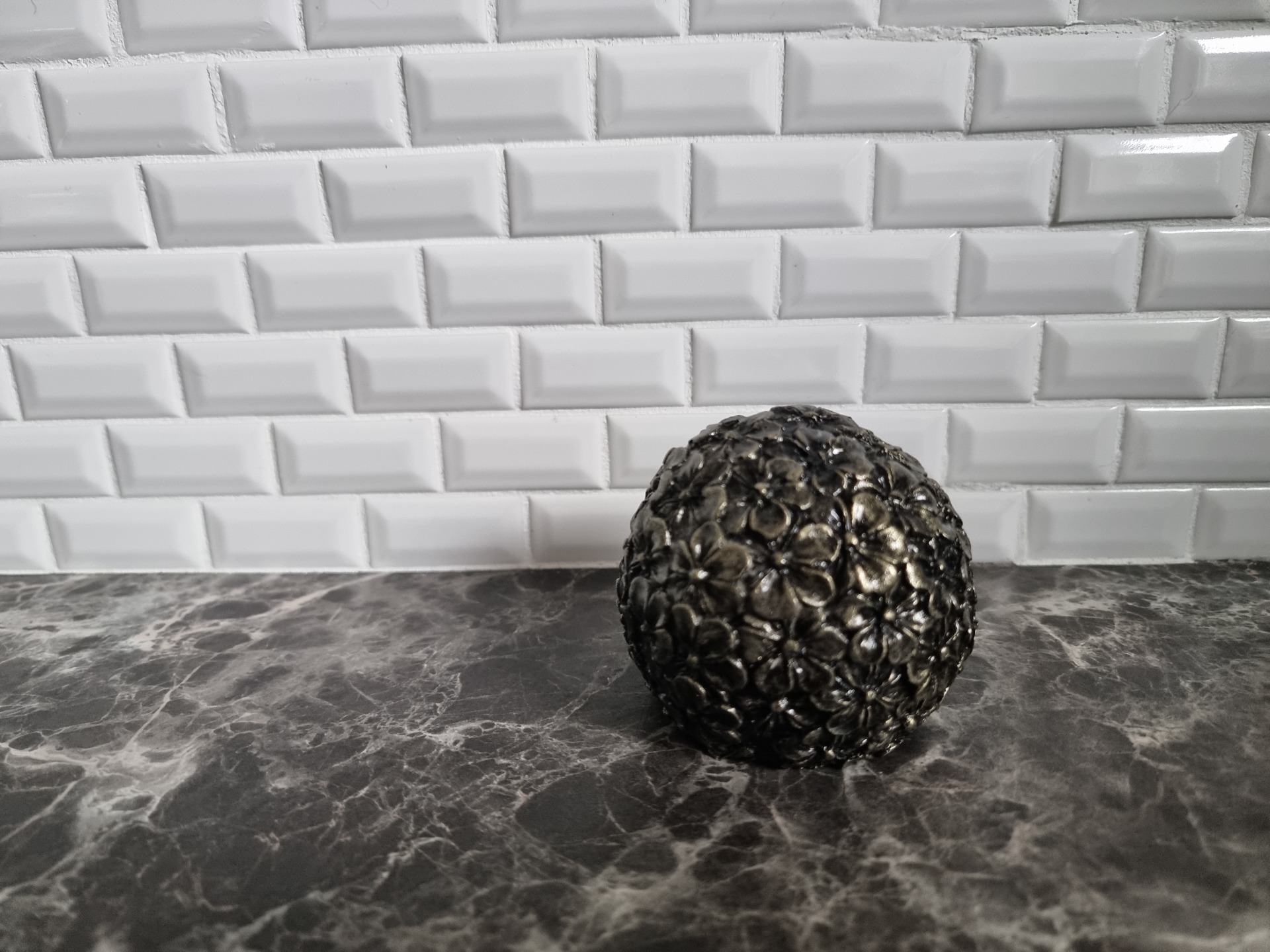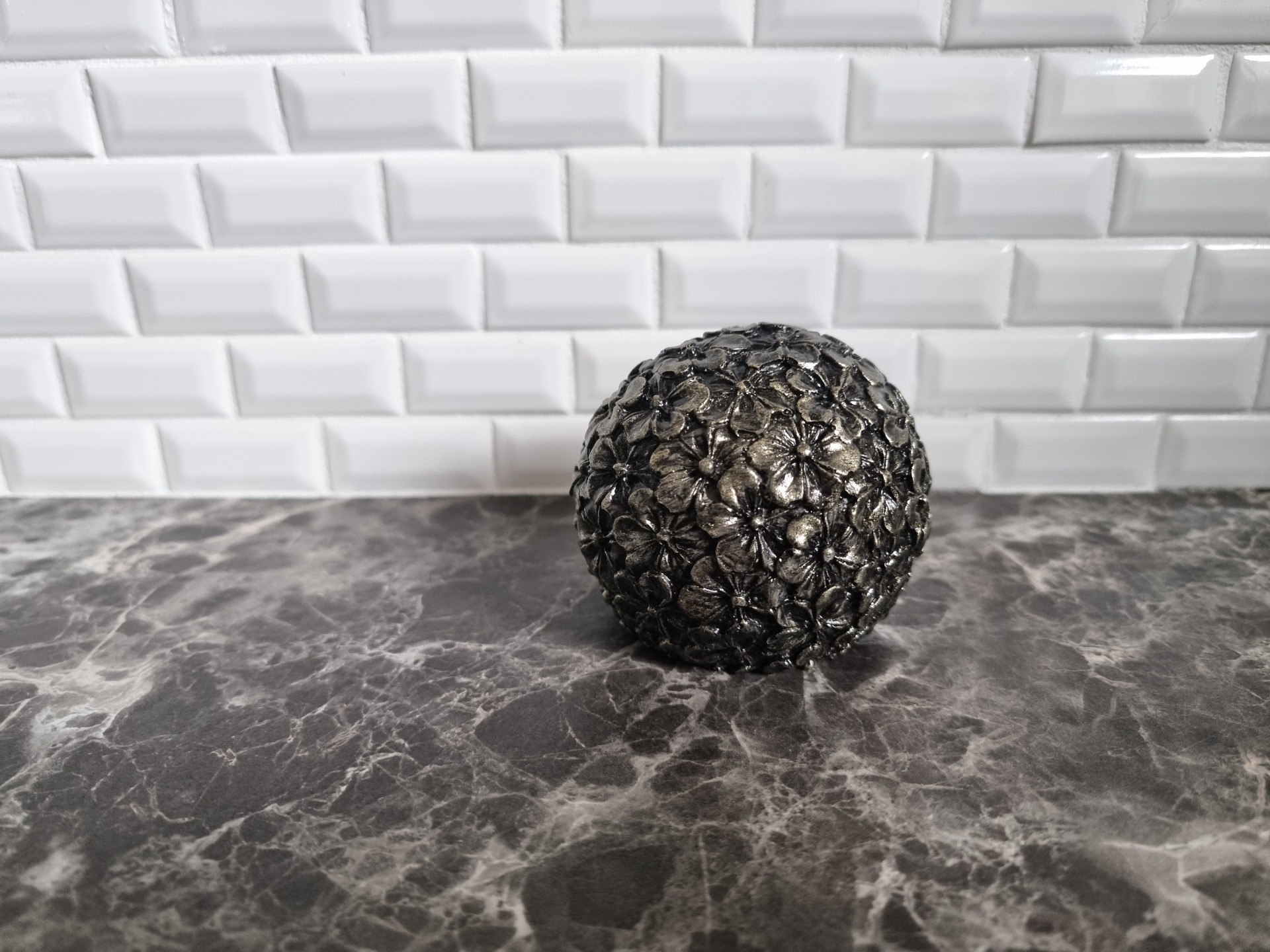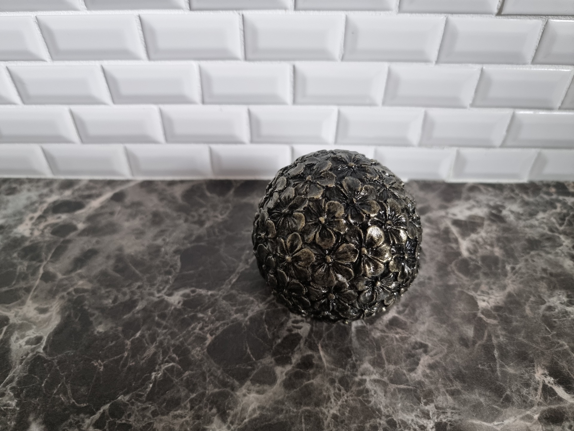 Denne sorte blpmster betonkugle er en unik og kunstnerisk dekoration til dit hjem. Med smukke blomster og fortryllende guld highlights, tilføjer denne betonkugle en elegant og mystisk stemning til ethvert rum.